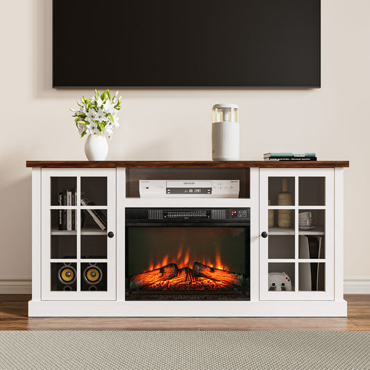 MARNUR Fireplace TV Stand for TVs up to 65", Media Entertainment Center Console Table with Glass Door, Farmhouse, White