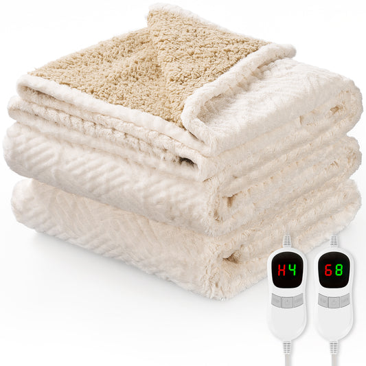 MARNUR Heated Blanket King Size 90"x100", Jacquard Faux Fur & Sherpa Electric Blanket with Dual Controllers,10 Heat Levels & 10H Timer, Machine Washable, White
