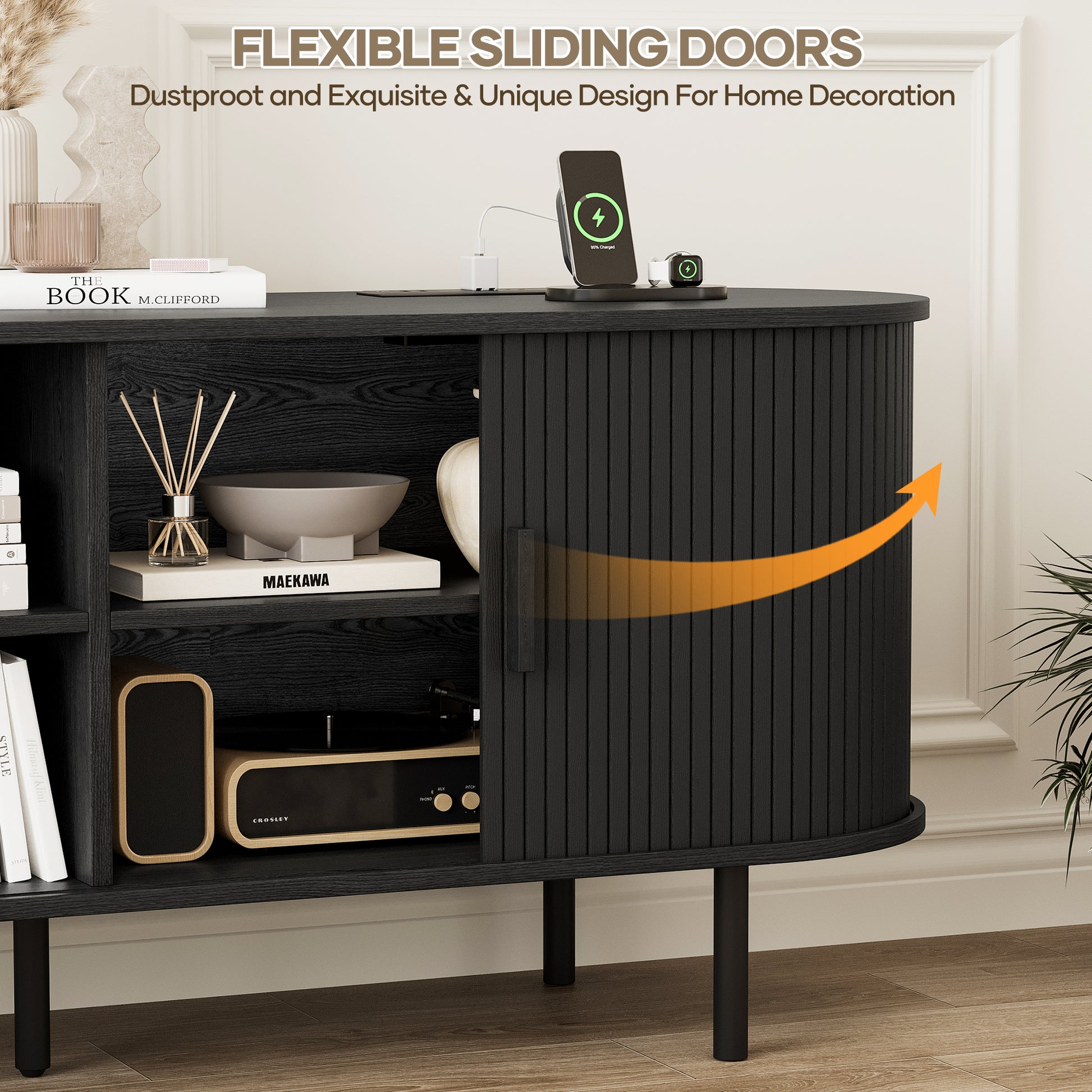 MARNUR 55" TV Stand for 60" TV, Wood Entertainment Center with Storage and Shelves, 2 Sliding Tambour Doors, Mid-Century Modern, Black