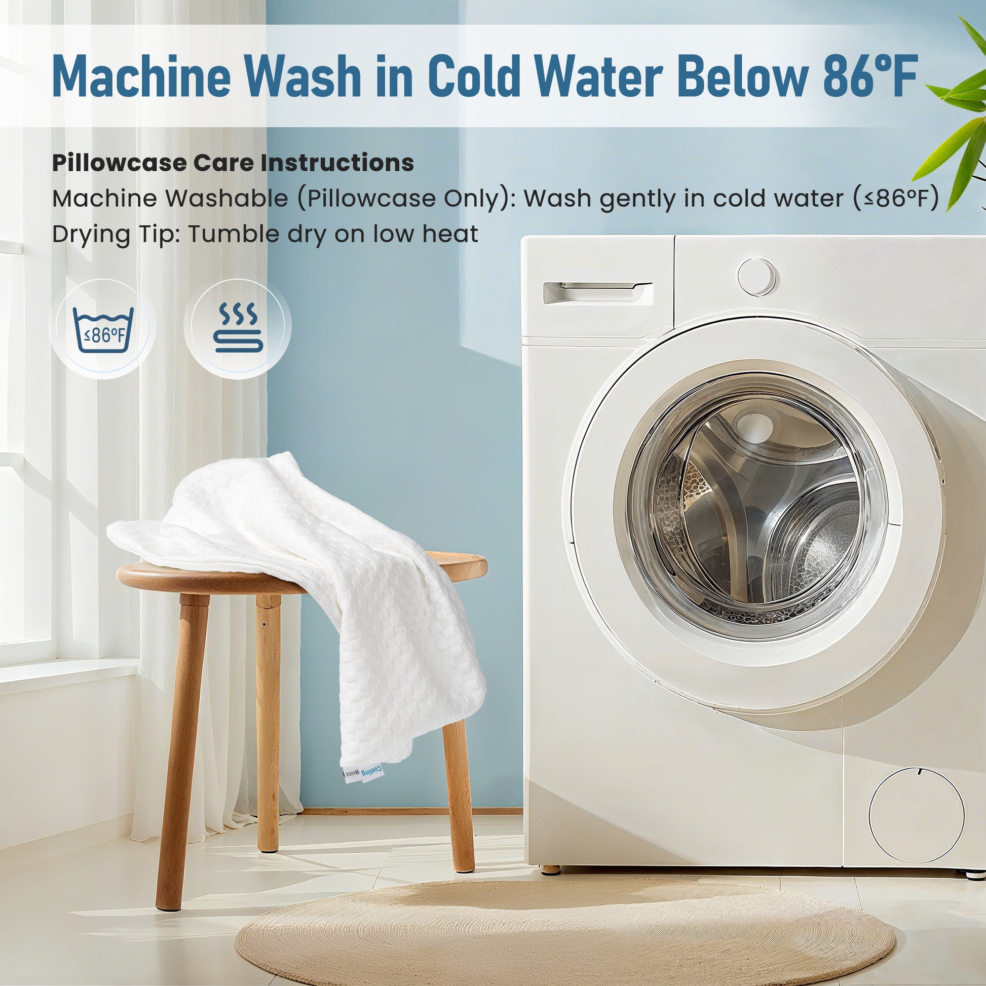- Dual-Sided Pillowcase for All-Season Comfort – Flip the bed pillow to enjoy cooling ice-silk fabric on hot nights and soft, breathable bamboo rayon on cooler nights. Perfect for hot sleepers and anyone looking for an adjustable pillow that stays comfortable year-round.