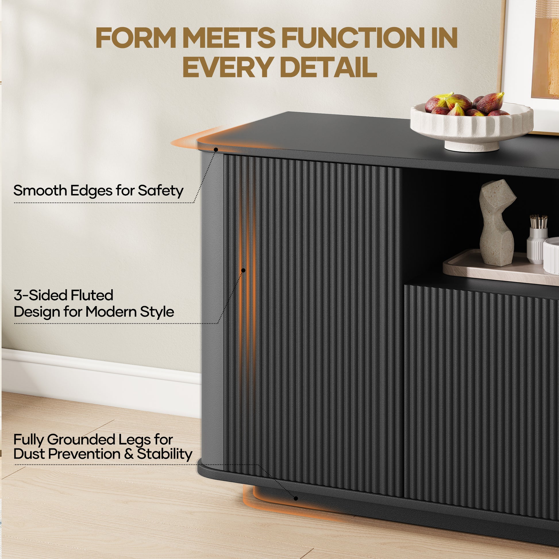 MARNUR Fluted TV Stand for TVs up to 65", 55" Modern Media Console with 3-Sided Fluted Design, Push-to-Open Doors for Living Room, Black